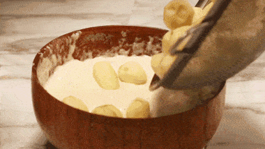 3、將煮好的慈菇倒入碗中裹上面糊。