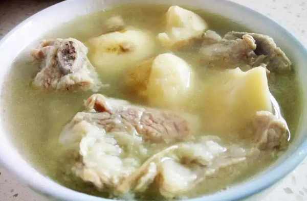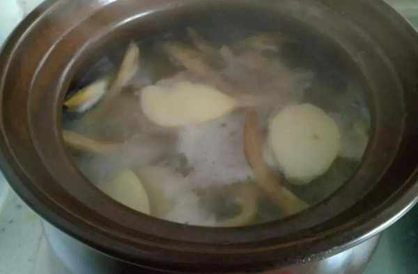 8、燉差不多一個小時的時候轉小火,中途鍋中水不足的時候,加一點開水進去,直到茨菇燉軟為止。放一點點鹽就可以吃瞭。