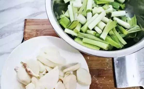 食材:茨菇10個,大蒜葉(蒜苗)一把,五花肉半斤。