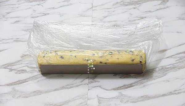 把做好的餅幹面糊裝入保鮮袋裡,搓圓弄好再放入U形長條餅幹模具裡,弄成貼合模具的長條狀,再送入冷凍室冷凍1小時左右。
