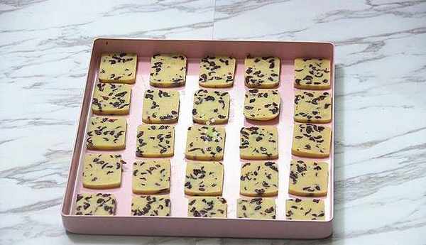 餅幹胚取出切片之前先預熱烤箱,設置上下火溫度180℃預熱10分鐘;把凍硬的長條形餅幹面團取出切成0.5cm左右厚度的片再放入不粘烤盤裡,然後送入烤箱中下層溫度180℃烘烤15-20分鐘,烘烤到10分鐘左右時把烤盤內外位置對調一下烘烤均勻;多盤的要分開烘烤。
