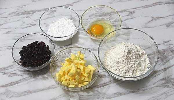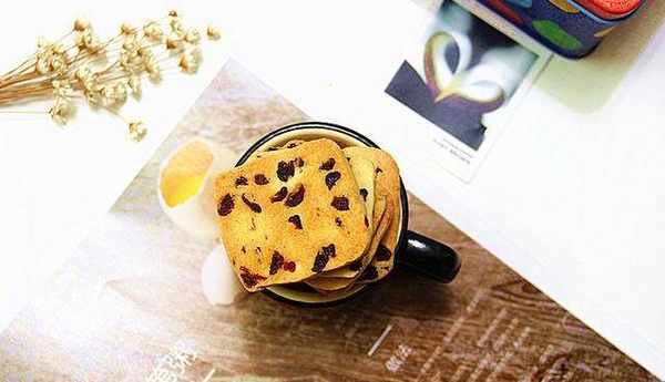 把這款餅幹所用到的食材準備好:低筋面粉230克、無鹽黃油130克、糖粉43克、雞蛋1個、蔓越莓幹90克;先把常溫雞蛋打散成全蛋液,然後把黃油切小塊放室溫軟化;蔓越莓幹清洗、切成小塊、浸泡一下、瀝水備用。