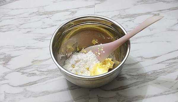 等黃油軟化後,往黃油裡加入所有糖粉,再用矽膠刮刀把糖粉和軟化的黃油混合,最後把雞蛋液分次加入黃油裡攪拌融合。