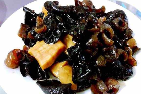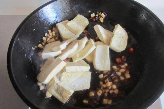 (5)鍋內放油燒熱,加入豆腐、木耳、蔥、薑煸炒。