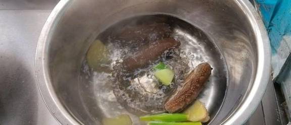 (3)鍋中放入兩杯清水、半湯匙酒、一片生薑、一條大蔥,燒開後放入海參,煮5分鐘後撈起,瀝幹待用。