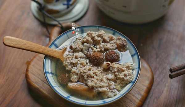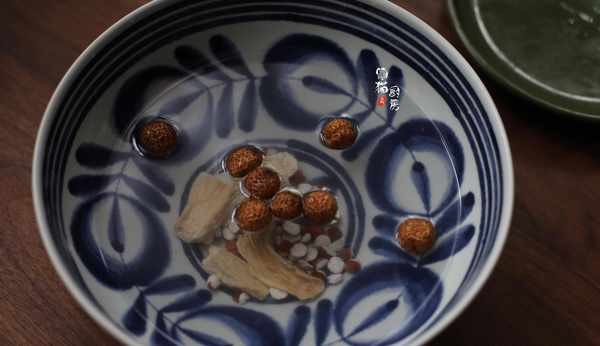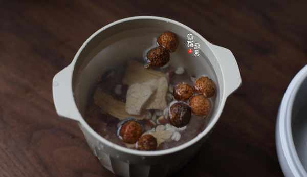 5.泡過瘦肉春砂的瘦肉水不用倒掉,直接把洗幹凈的幹淮山、芡實放入燉盅內,隔水蒸燉1小時左右即可。