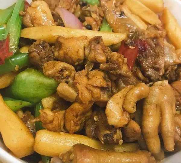 (4)然後倒入雞塊、山藥、土豆,翻炒至上色均勻,加入2勺生抽,1勺老抽,1勺蠔油,適量雞精翻炒均勻;