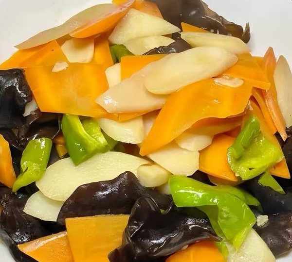 (2)山藥、胡蘿卜、木耳焯水2分鐘後撈出備用;