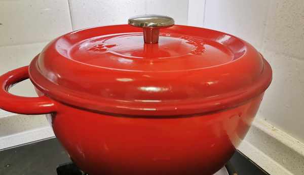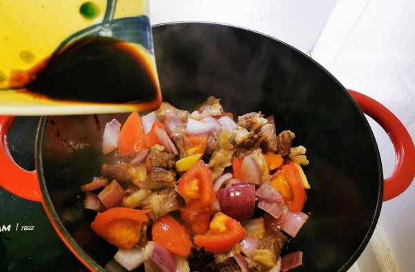4.倒入生抽老抽汁、冰糖,鍋內食材翻炒均勻,註意火候,琺瑯鍋我用的是中火。再加入適量熱水,熱水是食材的2倍多,一次加足,不要中途加水。因為熱水可以讓牛肉表面的蛋白質凝固,保留肉中的氨基酸,肉味更鮮美。蓋上蓋子,燉煮30-40分鐘。另可以添加山楂,利於牛肉快速煮熟。