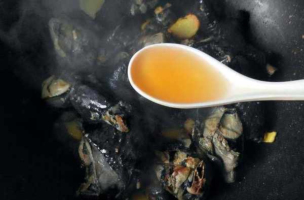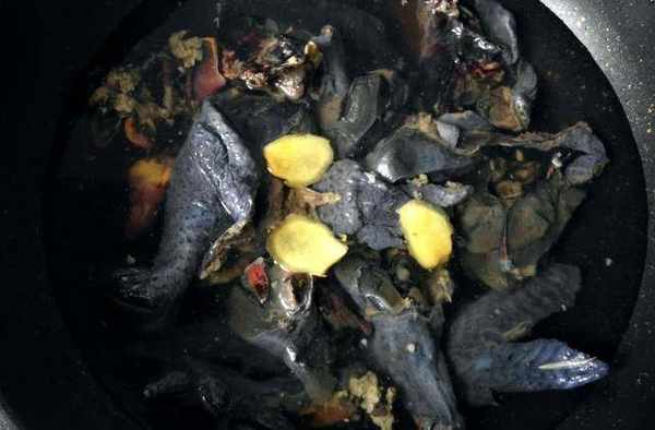 步驟六:放入烏雞,放一勺料酒,將烏雞炒香。