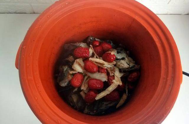 步驟七:將炒好的烏雞放入燉鍋,放紅棗,當歸,加適量的開水,按燉煮鍵,燉2小時。