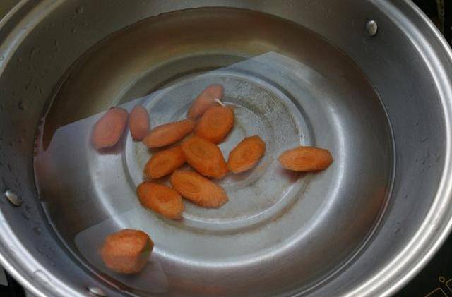 取一個鍋,加入適量的水,放胡蘿卜片先煮著