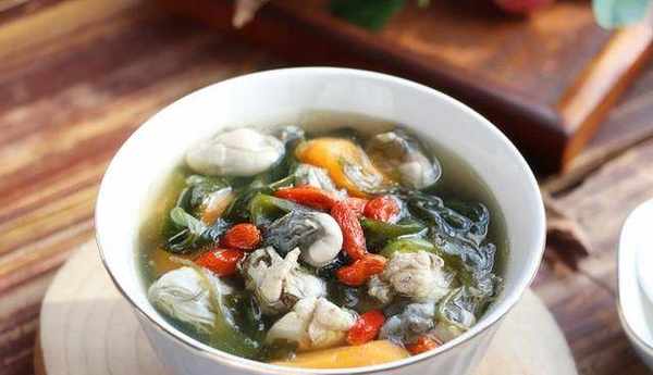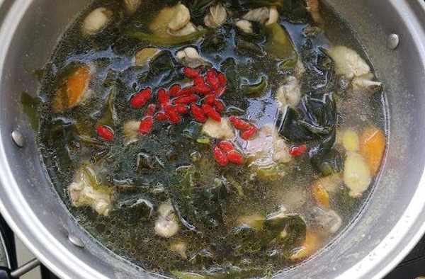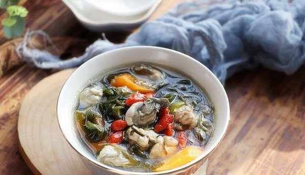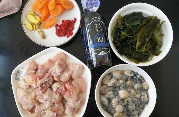 主材料:海帶苗200克,雞骨250克,鮮蠔200克,胡蘿卜30克,薑片8克,枸杞子10克,沙拉油1小勺
