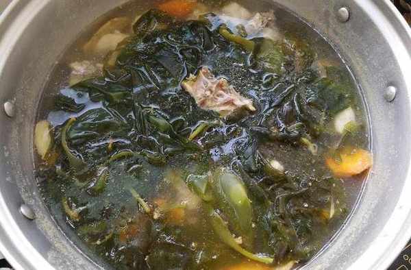 待雞骨煮約30分鐘,把泡透的海帶苗放鍋內繼續煲15分鐘