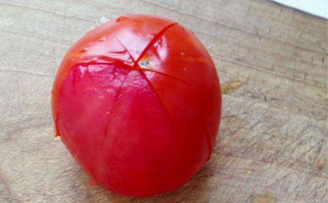 步驟1:準備好一些食材備用,一個番茄切一些口子,開水壺煮一些冷水,番茄都碗中,用沸水燙一下,用手撕掉西紅柿的外皮。