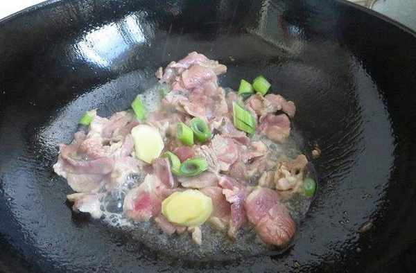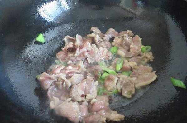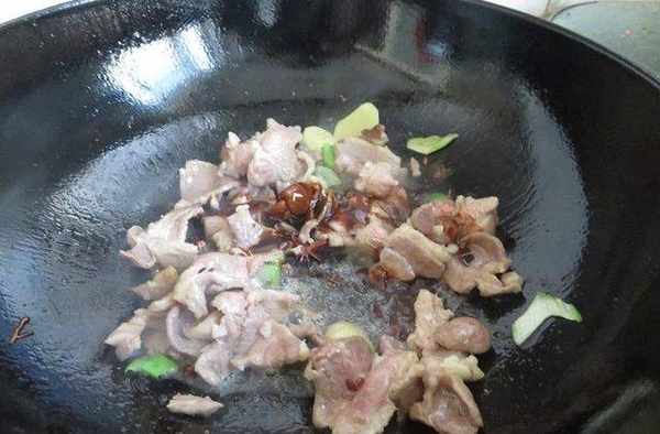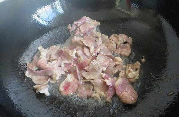 3、鍋中放油燒熱後放入肉片翻炒至變色水分析出