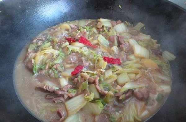 【用料】:白菜750克,羊肉500克,粉條100克,小蔥1棵,薑1塊,幹辣椒2個,花生油40克,花椒1克,八角1顆,鹽半勺,醬油2勺,黃豆醬2勺
