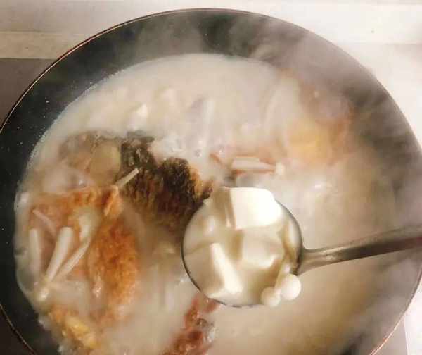 大火煮開轉小火煎30分鐘,打開蓋子看到魚湯變淡白色,加入豆腐和蘑菇繼續燉10分鐘。