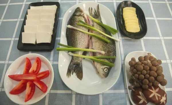 鯽魚一條、嫩豆腐半塊、香菇3個、杏鮑菇一個、金針菇半顆、海鮮菇半袋、開水一壺、蔥適量、薑3片、鹽適量、油適量。