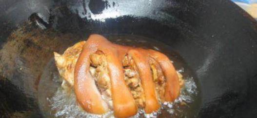 第四步:接下來就到瞭最重要的特殊步驟,油炸!鍋裡倒入食用油,燒熱後將豬蹄下鍋油炸,註意翻面使兩面受熱均勻,炸至表皮金黃色後即可出鍋。