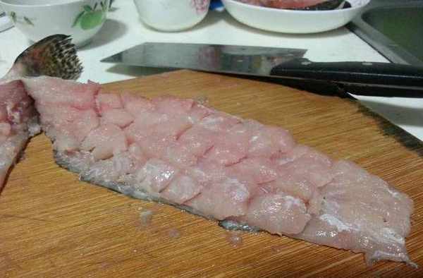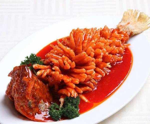 1.取鱖魚1條(重約800克)宰殺制凈,先在靠近頭部的地方切一刀去掉魚頭,沿著魚的中骨將魚身一片為二保持尾部相連,片去魚的大骨,再斜刀45度片去兩面魚肚上的腹刺。2.從魚頸部往魚尾方向,斜刀45度每隔5毫米切一刀,不要切斷魚皮,一直切到魚尾處,再切另一面。3.把魚身旋轉角度,每隔5毫米直刀再切(不要切斷魚皮)。4.把切好花刀的魚肉和魚頭放盤子裡,加鹽2克、白胡椒粉0.5克、料酒10克、蔥薑水20克醃15分鐘。步驟二:油炸。取醃制入味的魚身和魚頭放入一個碗內,打入一個蛋黃抓勻。把生粉300克放在不銹鋼盤內,將魚身和魚頭放在粉上,將粉均勻地抹在魚身和魚頭上,使魚肉間不粘連,提起魚尾抖去魚身上多餘的芡粉。一手提魚尾一手用筷子夾好魚頸部,放入燒至五成熱的油鍋中,小火浸炸至定形,再把魚頭放入炸至定形;等油溫升高至六成熱時,將魚身和魚頭再放入油中浸炸至色澤金黃,取出控油,擺入盤中造型。步驟三:成菜。鍋內留底油,燒至兩三成熱時,先放入番茄沙司400克小火炒勻,再放入白砂糖200克、水150克、鹽2克、白醋40克,小火熬至醬料濃稠,淋入50克燒至四成熱的油攪拌均勻備用,將復炸後的鱖魚裝盤,澆上熬好的番茄汁,撒上焯熟的河蝦仁20克和甜豆10克即可。