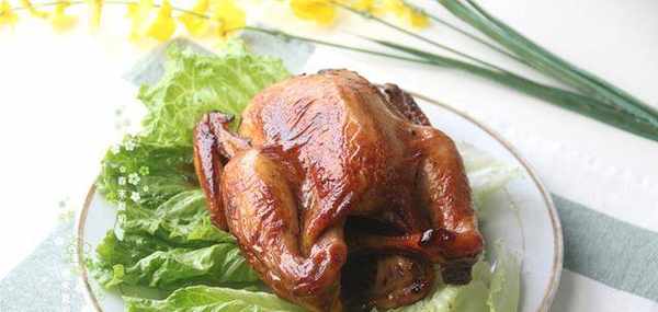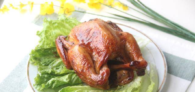 11、烹飪完成,上色滿意則可戴隔熱手套把烤盤取出放涼,否則可以繼續烘烤。烘烤好的全雞取出,擺在墊瞭生菜的盤子裡,烤出的肉汁澆在雞身上面,享用時可以剪切開或直接手撕著吃。