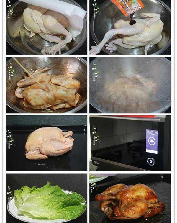 9、微波爐烘烤功能預熱完成,把全雞連同烤盤送入微波爐,最後一層層架上,300度開始烘烤;烤10-15分鐘時,把烤盤左右位置對調繼續烘烤3、4分鐘,觀察上色的情況,如需要,在“時間”觸摸鍵選擇增加烘或減少烤時間,可依上色情況看是否需要把烤盤內外位置對調一層繼續烘烤;本次烘烤約25分鐘。