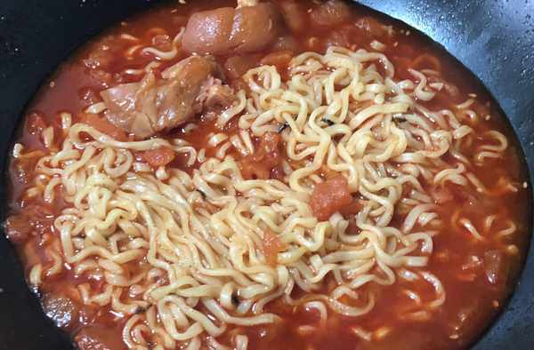 5、然後加入適量的水,下入剛才的方便面,大火燒開