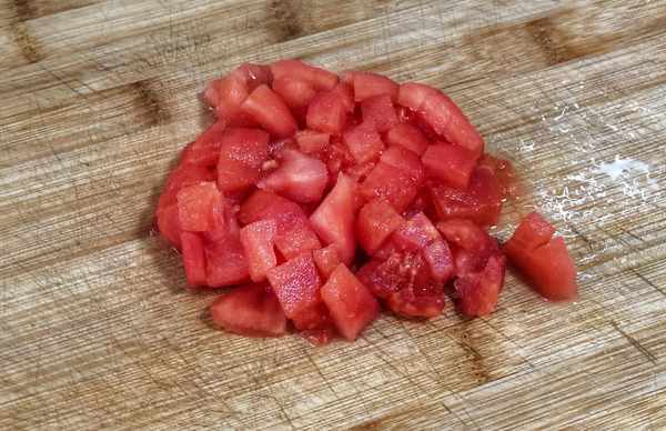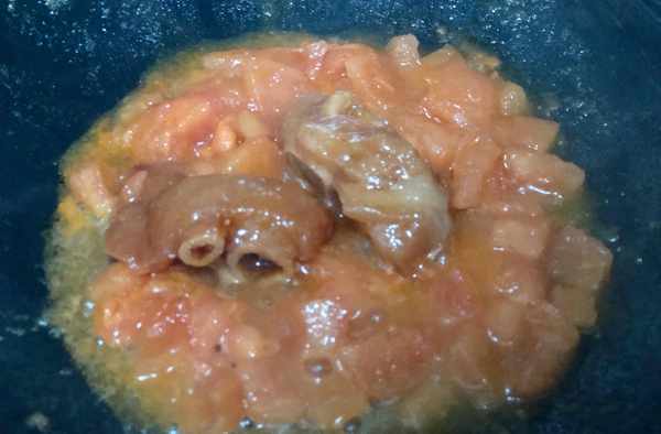 4、一般我會在番茄裡加入兩塊鹵過的豬腳一起炒,如果沒有可以用別的東西代替,不放也可以