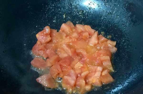 3、接下來炒番茄,開小火熱鍋下一點油,放入番茄慢慢翻炒,加入一小勺白糖