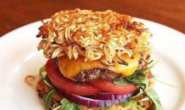 泡面面包:將泡面面條用熱水沖泡3分分鐘後瀝幹,然後再炸一下,最後把面條、牛肉調理包、酸菜包依序夾入面條塊中,淋上沙拉醬及蕃茄醬即可。