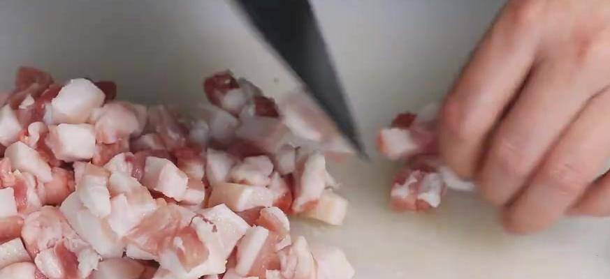 準備半斤的五花肉切成小塊,準備拌個洋蔥切碎,準備兩勺叉燒醬,約三勺的生抽,一勺老抽,一勺蠔油,一勺黃豆醬,一勺白砂糖。鍋裡面不用放油,把五花肉放進去煸炒,炒出油分後加入一勺的薑粉去腥。一勺白酒攪拌均勻。加入洋蔥末,倒入之前準備好的叉燒汁攪拌均勻,黏稠的狀態大火收汁。