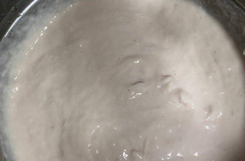 魚茸裡加入鹽和白胡椒粉,再加入玉米淀粉,繼續順著一個方向攪拌