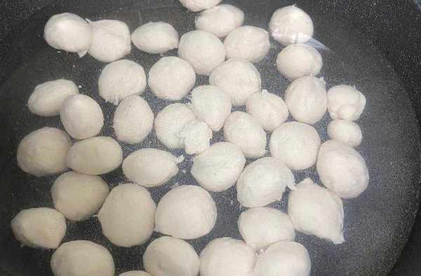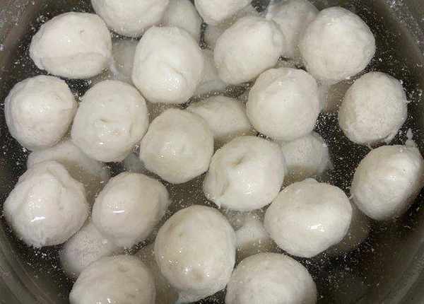 冷水一個一個下入擠好的魚丸,然後開火燒至魚丸浮起,關火,將魚丸撈出放入冷水中,完工!