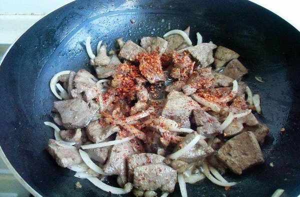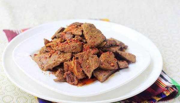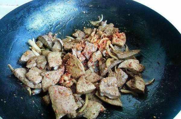 因為羊肝沒有油脂,可以多加羊尾巴油翻炒先放鹽,再放辣椒面,等羊肝熟後快出鍋時再放孜然記住孜然粉千萬不能加的太早,否則就沒香味