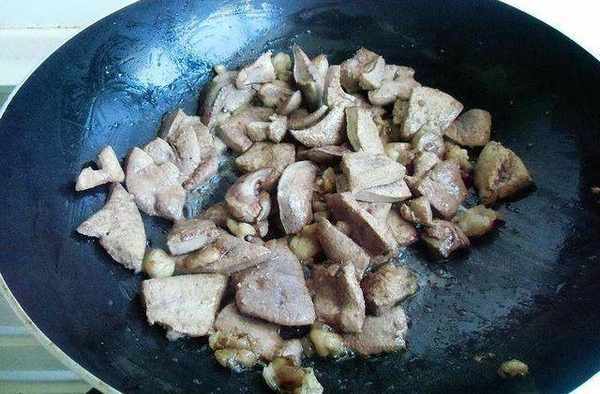 3、加羊肝翻炒均勻出水分出香味