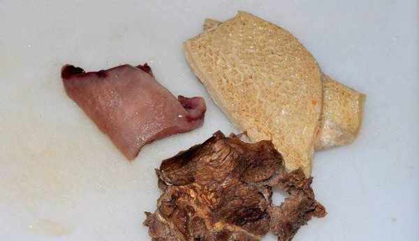 1.白鹵鹵好以後的牛頭皮、金錢肚、牛肉晾涼備用(白鹵料如下:八角、 三奈、草 果、小茴香、桂皮、花椒、幹辣椒、老薑、大蔥、鹽、白 酒)