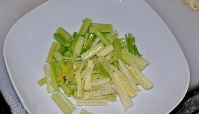 6.青芹菜切段打底(肺片這道菜對於芹菜的要求很高,必須是青芹菜,白 芹菜或西芹放進去味道完全就變瞭,青芹菜越細越新鮮越好)