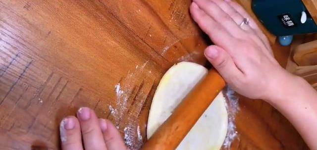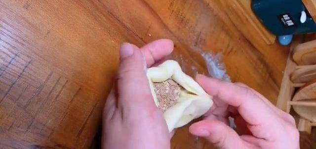 第6步:取一個面劑,兩頭捏在一起,整理成圓形,然後搟成薄餅,放上糖餡包起來。