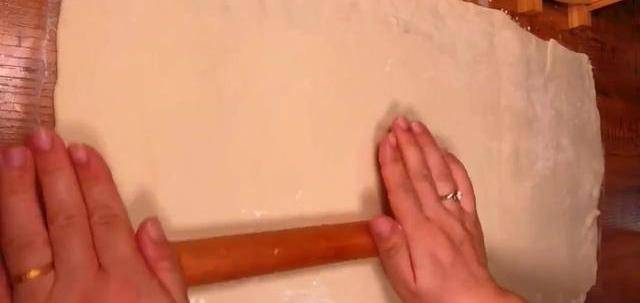 第4步:醒好的面團搟成長方形大餅,塗上油酥。