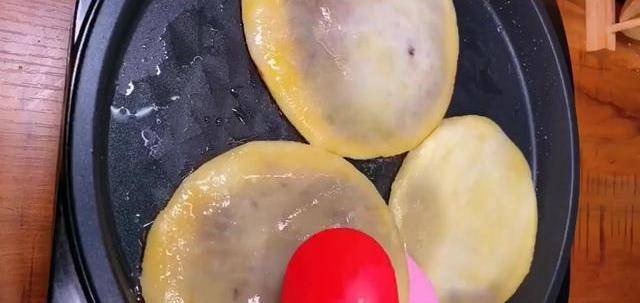 第8步:平底鍋預熱刷油,放入鍋中,表面刷油,鎖住水分,蓋上蓋子烙至一面變色,翻面兩面金黃小餅鼓包就是熟透瞭。