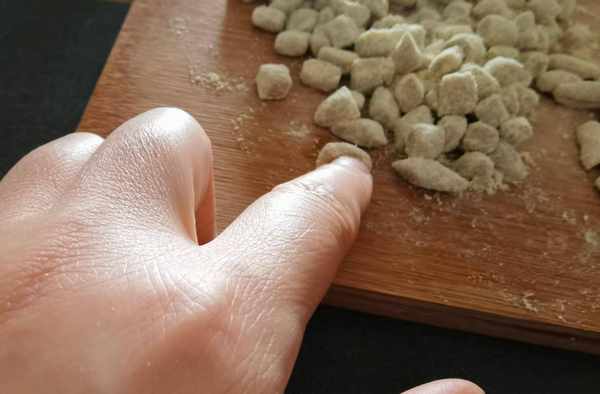 如圖所示,以食指指肚按壓面丁並將其搓薄卷曲,一個貓耳朵便完成瞭,看看想不想一個個圓圓的小貓耳朵呢?想必這就是這種面食名字的由來吧。熟練之後,可以加快速度,如果希望搓出的貓耳朵可以更美觀,也可選擇在案板上鋪壽司卷簾再行搓制。