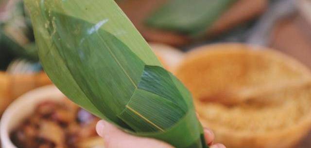 5、一切準備好之後開始包粽子。拿兩片大小一致的粽葉重疊起來,粽葉大頭的一邊,用剪刀剪掉一點梗,然後在大頭這一邊,把粽葉往小頭方向疊,形成一個鬥,然後放上一層糯米。再放入醃好的肉和蛋黃,再鋪上一層糯米,然後把粽葉蓋上,捏緊多出來的,折的往一邊按住。