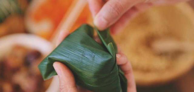 6、用一個指頭壓住線,其他裹上粽子,如果喜歡吃緊實一些的粽子可以綁緊一些,喜歡吃松散的就不要綁太緊瞭,綁好打結,粽子就包好瞭。