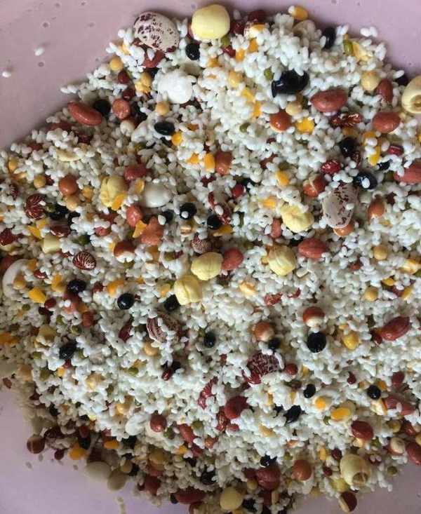 2、把紫薯撈出來和糯米混合均勻,包法都一樣。