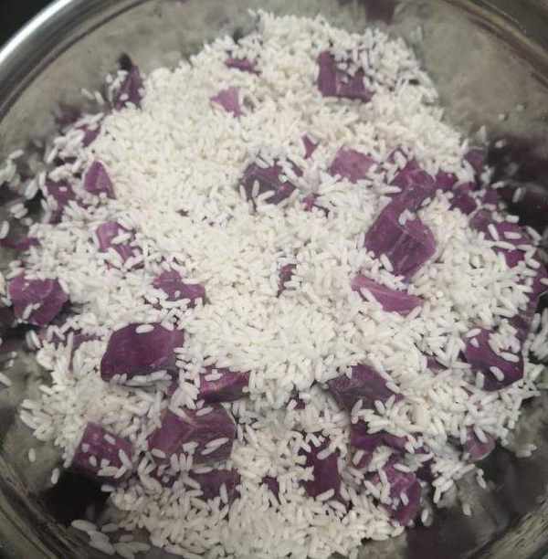 1、糯米清洗幹凈,控幹水分,再準備一碗檸檬水,就是拿個碗裝水,裡面擠上一些檸檬汁,然後把紫薯去皮切丁,放入檸檬水裡泡一會,防止紫薯變色。