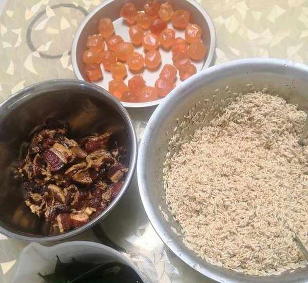 2、辦法和肉粽子也是一樣的,先放一層糯米和豆,再放一個蜜棗,再鋪上一層糯米豆。