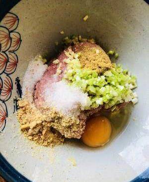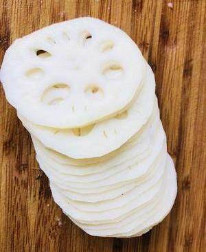 藕片水中撈出擦幹表面,加肉餡,再有另一片相鄰的藕片蓋上