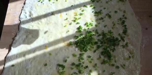 不用揉面,直接整成餅,用搟面杖搟薄一些。表面抹油撒鹽和少一些的幹面粉,蔥花鋪好,卷起來。再切成劑子,兩頭包好。做成饅頭的造型。二次醒發15分鐘,雞子放在案板上的時候也要多撒一些幹面粉,不然一會就黏住瞭。電餅稱預熱刷油,發張餅用鏟子按扁,底面定型變黃就翻面。