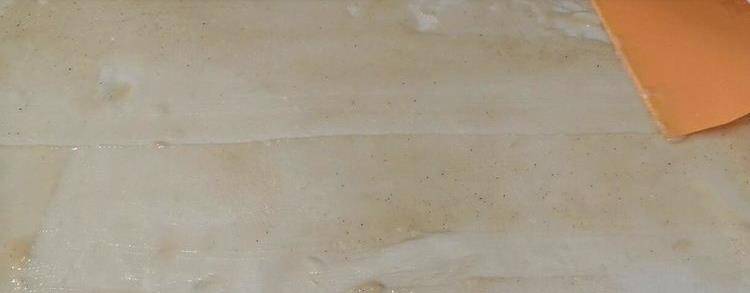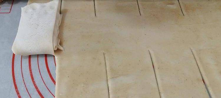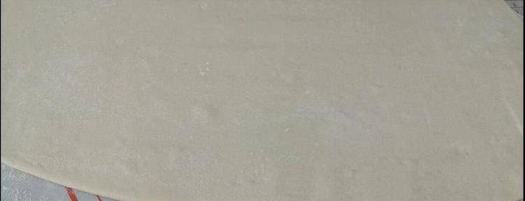 搟勻後,我們把四邊都用搟面杖戳齊,然後將提前做好的油酥均勻的塗抹到面皮上,沒有油酥也可以直接用食用油